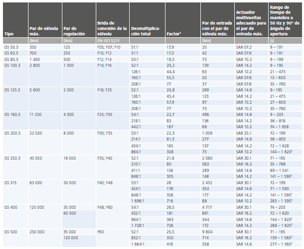 Os atuadores multivoltas adequados propostos são escolhidos com o objetivo de atingir o torque máximo de saída. Se os requisitos de torque forem menores, também poderão ser usados atuadores multivoltas menores. Dados detalhados podem ser encontrados nas folhas de dados separadas.
