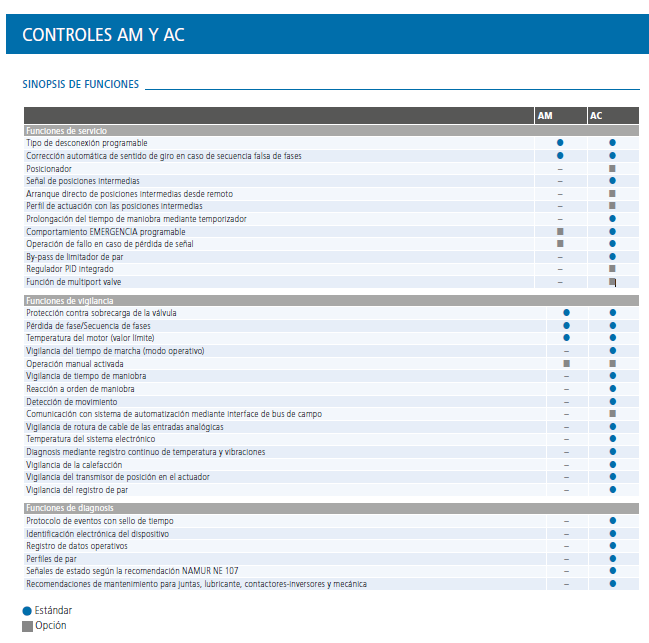 As funções de diagnóstico incluem um registro de eventos com registro de data e hora, a adoção de curvas características de torque, o registro contínuo de temperaturas e vibrações no atuador ou a contagem de partidas e tempos de funcionamento do motor. Além das funções básicas, o CA oferece várias possibilidades para atender a requisitos especiais. Por exemplo, o by-pass limitador de torque para liberar as válvulas de suas posições ou funções fixas para alterar o tempo de manobra a fim de evitar pressão na tubulação.